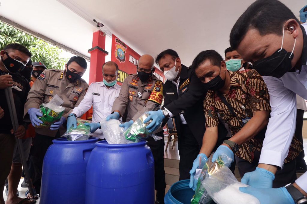 AlurNews.com, Batam – Barang Bukti Narkotika jenis Sabu seberat 46.926,67 gram atau hampir 47 Kg yang didapatkan dari empat orang tersangka dilakukan pemusnahan pada hari Senin, 8 Februari 2021 dengan cara direbus menggunakan air panas. Hal tersebut disampaikan oleh Wakapolda Kepri Brigjen Pol Drs. Darmawan, M. Hum., saat memimpin Pemusnahan Barang Bukti di Mapolda Kepri, Senin (8/2/2021). Dalam kegiatan tersebut Wakapolda Kepri didampingi oleh Kabid Humas Polda Kepri Kombes Pol Harry Goldenhardt S., S.IK., M.Si., Dirresnarkoba Polda Kepri Kombes Pol Muji Supriyadi, S.H., S.Ik., M.H, dan Kasubdit II Ditresnarkoba Polda Kepri Kompol Henry Andar H Sibarani, S.Ik., serta dihadiri perwakilan dari Pengadilan Negeri Kota Batam, Kejaksaan Negeri Kota Batam, LSM Granat, Pengacara dan BPOM.