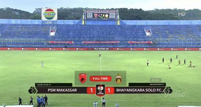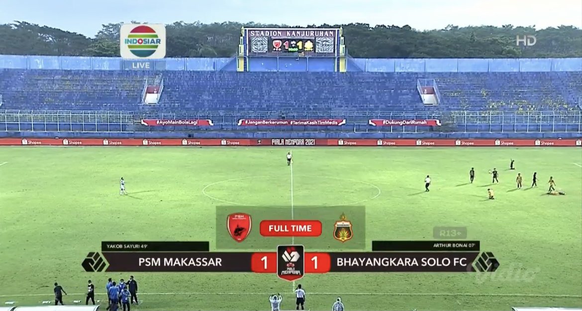 PSM Makassar dan Bhayangkara Solo FC bermain imbang 1-1 dalam lanjutan laga Piala Menpora 2021 di Stadion Kanjuruhan, Malang, Sabtu (27/3) sore WIB.