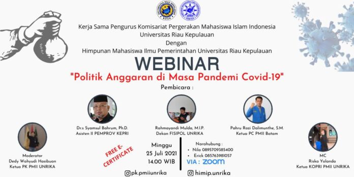 Batam, AlurNews.com – Pengurus Komisariat Pergerakan Mahasiswa Islam Indonesia (PK PMII) Universitas Riau Batam dan Himpunan Mahasiswa Ilmu Pemerintahan (Himip) Universitas Riau Kepulauan Batam akan menyelenggarakan Webinar dengan tema “politik anggaran di masa pandemi Covid-19”. Kegiatan tersebut akan dilaksanakan melalui platform Zoom Meeting, Minggu siang (25/07/2021).