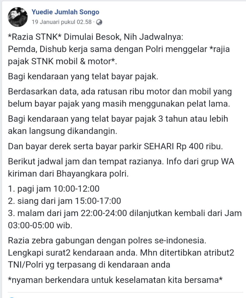 JAKARTA, AlurNews.com – Beredar narasi di media sosial Facebook yang menyebut razia Surat Tanda Nomor Kendaraan (STNK) bagi kendaraan yang menunggak pajak tiga tahun atau lebih.