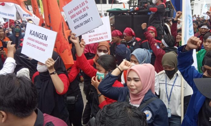 “Kenaikan BBM sangat menyengsarakan masyarakat, terutama kaum buruh, kenaikan BBM, tidak diiringi dengan kenaikan upah sebelumnya, sehingga daya beli masyarakat anjlok,” ucap orator.