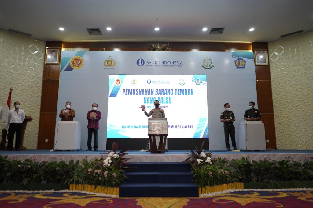 “Pemusanahan 5.052 lembar uang palsu ini sebagai langkah untuk melindungi masyarakat dari kejahatan uang palsu, serta dapat mempengaruhi angka inflasi di Kepri,” Kepala Perwakilan Kantor BI Kepri, Musni Hardi K Atmaja usai kegiatan pemusnahan uang palsu bersama instansi terkait di Gedung BI Kepri, Batam Center, (19/10/2022).