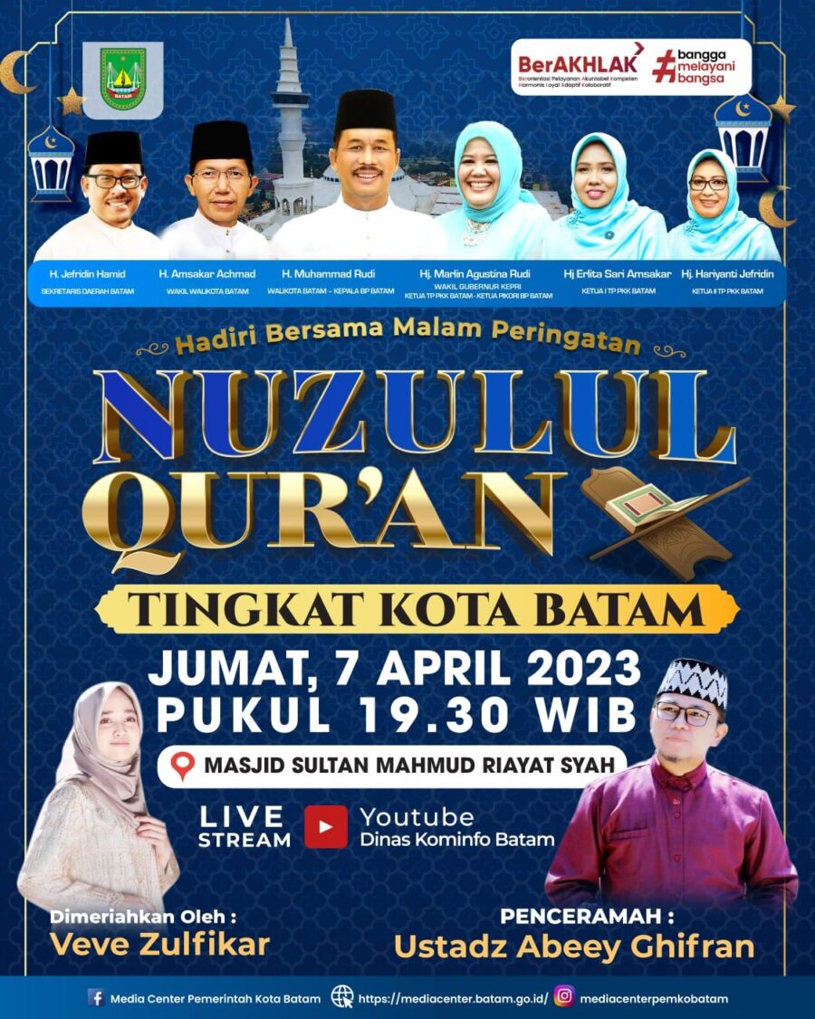 Wali Kota Batam Muhammad Rudi mengundang seluruh warga masyarakat, khususnya kaum muslim, untuk hadir dalam acara malam Nuzulul Qur’an 1444 H.