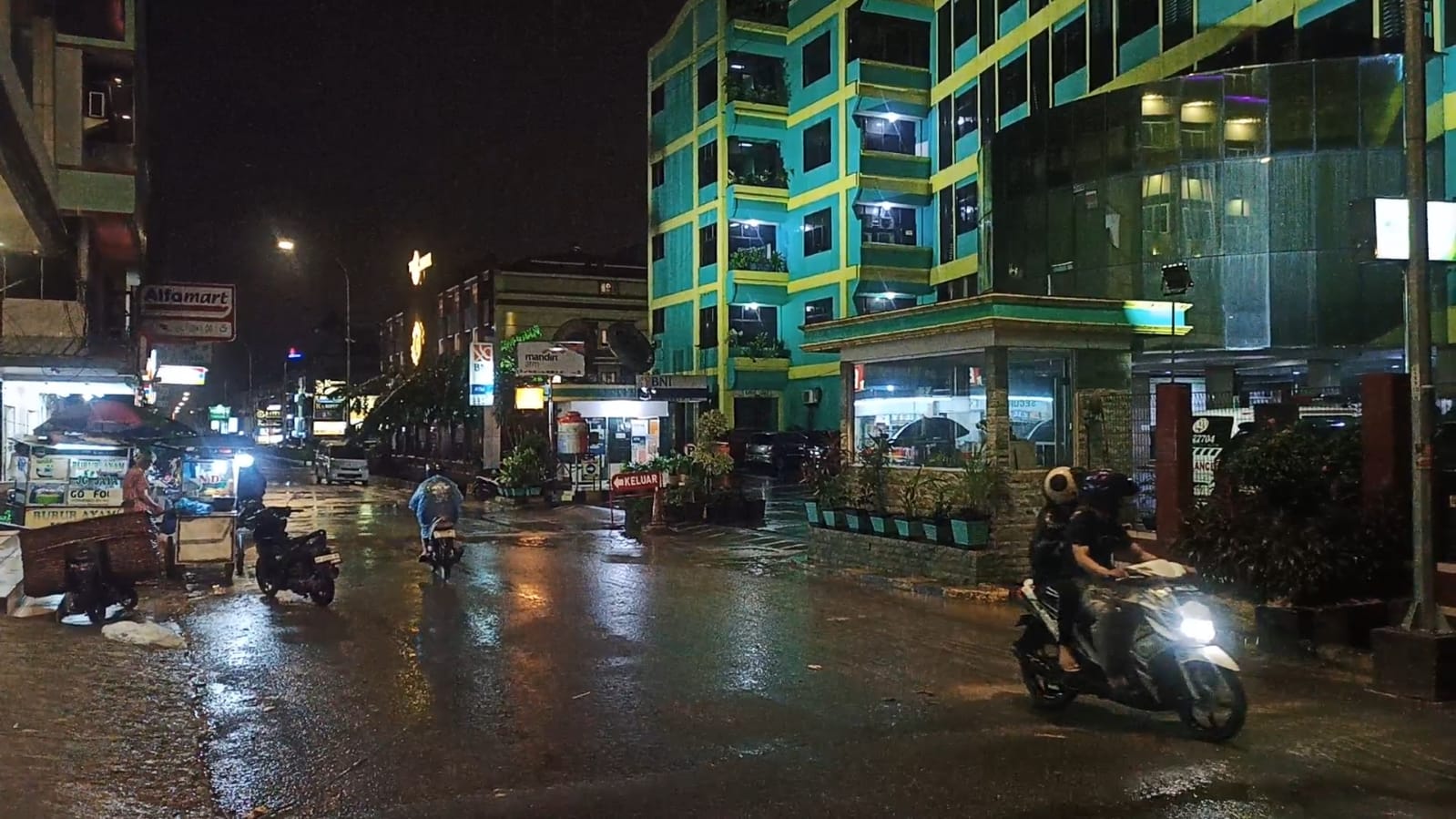 Namun, ketika melintas di depan Rumah Sakit Harapan Bunda, pengendara sepeda motor tersebut mengalami kesulitan karena derasnya arus air yang tidak mampu ditampung oleh drainase. Akibatnya, motor mereka oleng dan terjadi kecelakaan.