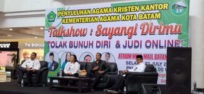 AlurNews.com – Kantor Kementerian Agama (Kemenag) Kota Batam menggelar Talk Show bertemakan Sayangi Dirimu Tolak Bunuh Diri dan Judi Online. Kegiatan di gelar di Atrium Mega Mall Batam Center, Kota Batam, Provinsi Kepulauan Riau (Kepri).