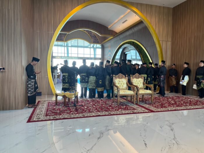 Kedatangan keduanya akan disambut oleh kompang dan tabur beras kunyit yang dilakukan oleh Lembaga Adat Melayu (LAM). Dilanjutkan dengan pemasangan tudung.