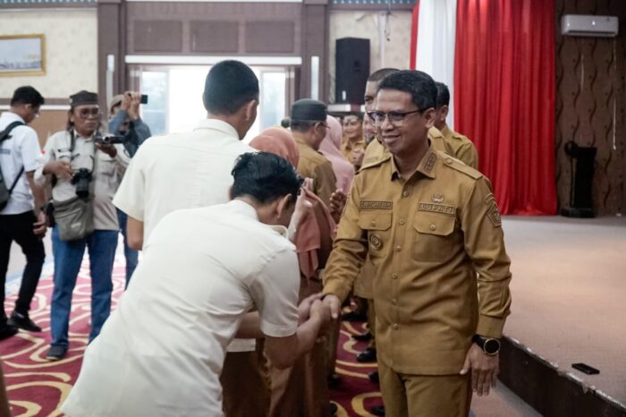 Bupati Karimun, Iskandarsyah dan Wakil Bupati Karimun, Rocky Marciano Bawole Halal Bihalal bersama ASN dan tenaga honorer saat apel perdana, Selasa (8/4/2025). (Foto: AlurNews)
