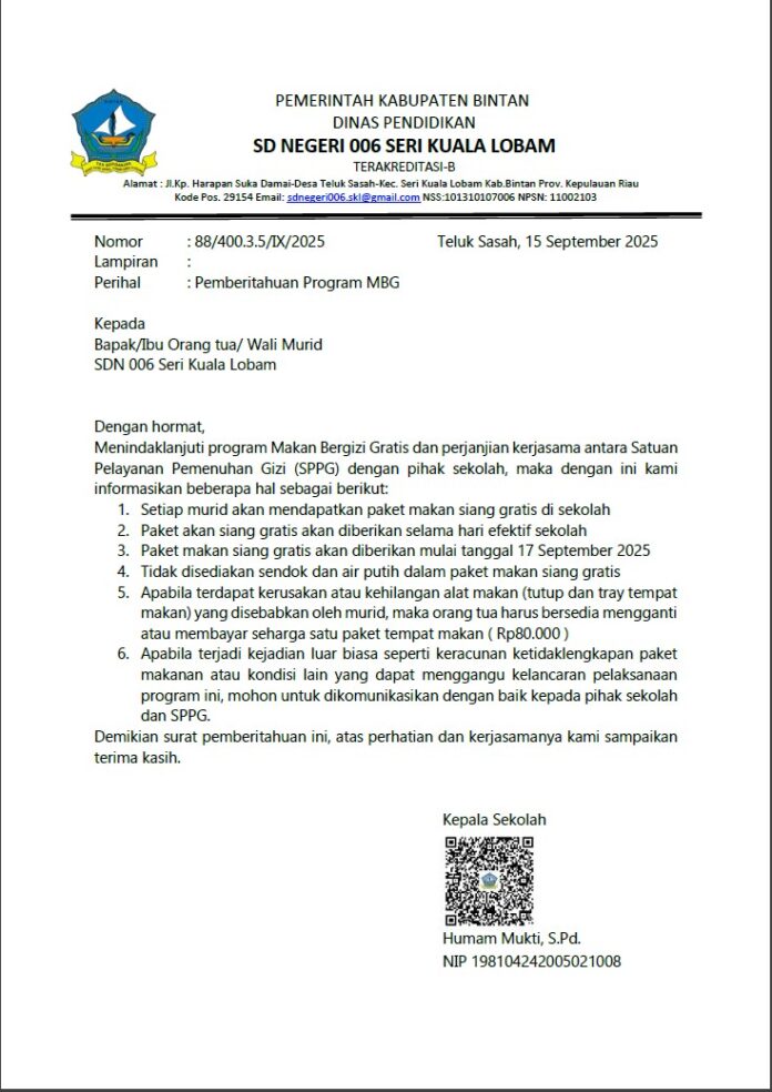 AlurNews.com – Pihak Sekolah Dasar Negeri (SDN) 06 Seri Kuala Lobam, Kabupaten Bintan, Kepulauan Riau angkat bicara mengenai ramainya surat perjanjian pelaksanaan program Makan Bergizi Gratis (MBG), yang kini viral di media sosial.
