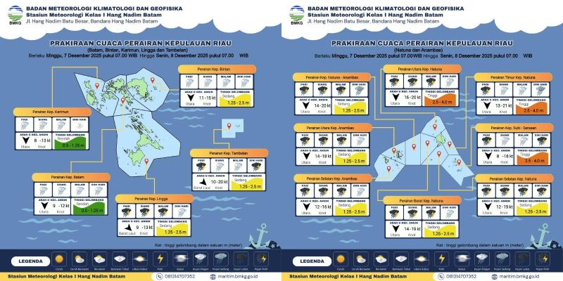 BMKG memprediksi kondisi laut masih belum stabil pada Senin (8/12/2025). “Waspada potensi ketinggian gelombang yang dapat mencapai hingga 2,3 meter di hampir seluruh wilayah perairan Kepulauan Riau, kecuali Perairan Karimun,” katanya.