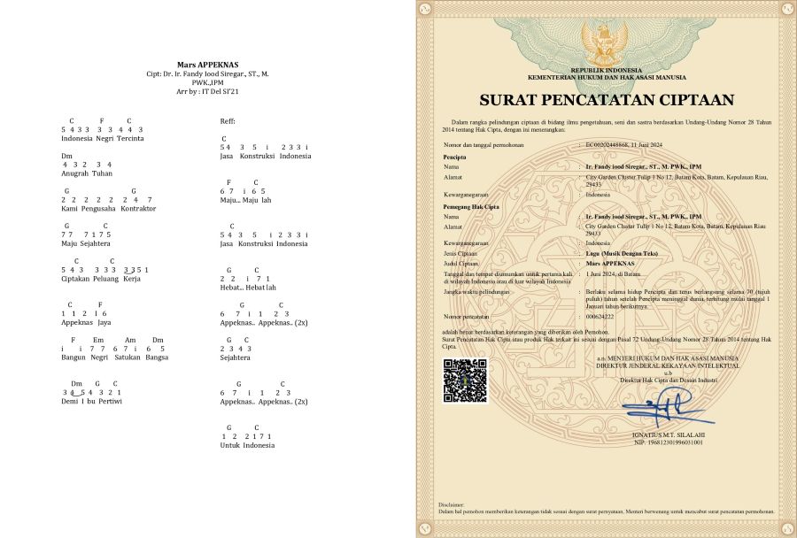 Sebagai pencipta, Fandy menyerahkan hak penggunaan Mars APPEKNAS untuk dimanfaatkan seluas-luasnya demi kemajuan Asosiasi Pengusaha Pelaksana Kontraktor dan Konstruksi Nasional serta penguatan peran industri konstruksi Indonesia. (red)
