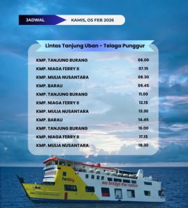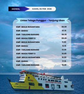 AlurNews.com – PT ASDP Indonesia Ferry (Persero) Cabang Batam melalui akun resmi media sosialnya merilis jadwal operasional kapal penyeberangan lintas Telagapunggur–Tanjunguban dan Tanjunguban–Telagapunggur untuk Kamis, 5 Februari 2026. Jadwal ini disiapkan guna mendukung kelancaran mobilitas masyarakat serta distribusi kendaraan antarwilayah.