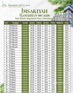 Jadwal ini meliputi waktu imsak, buka puasa, dan salat harian selama bulan Ramadan 1447 hijriah untuk wilayah Batam dan sekitarnya.